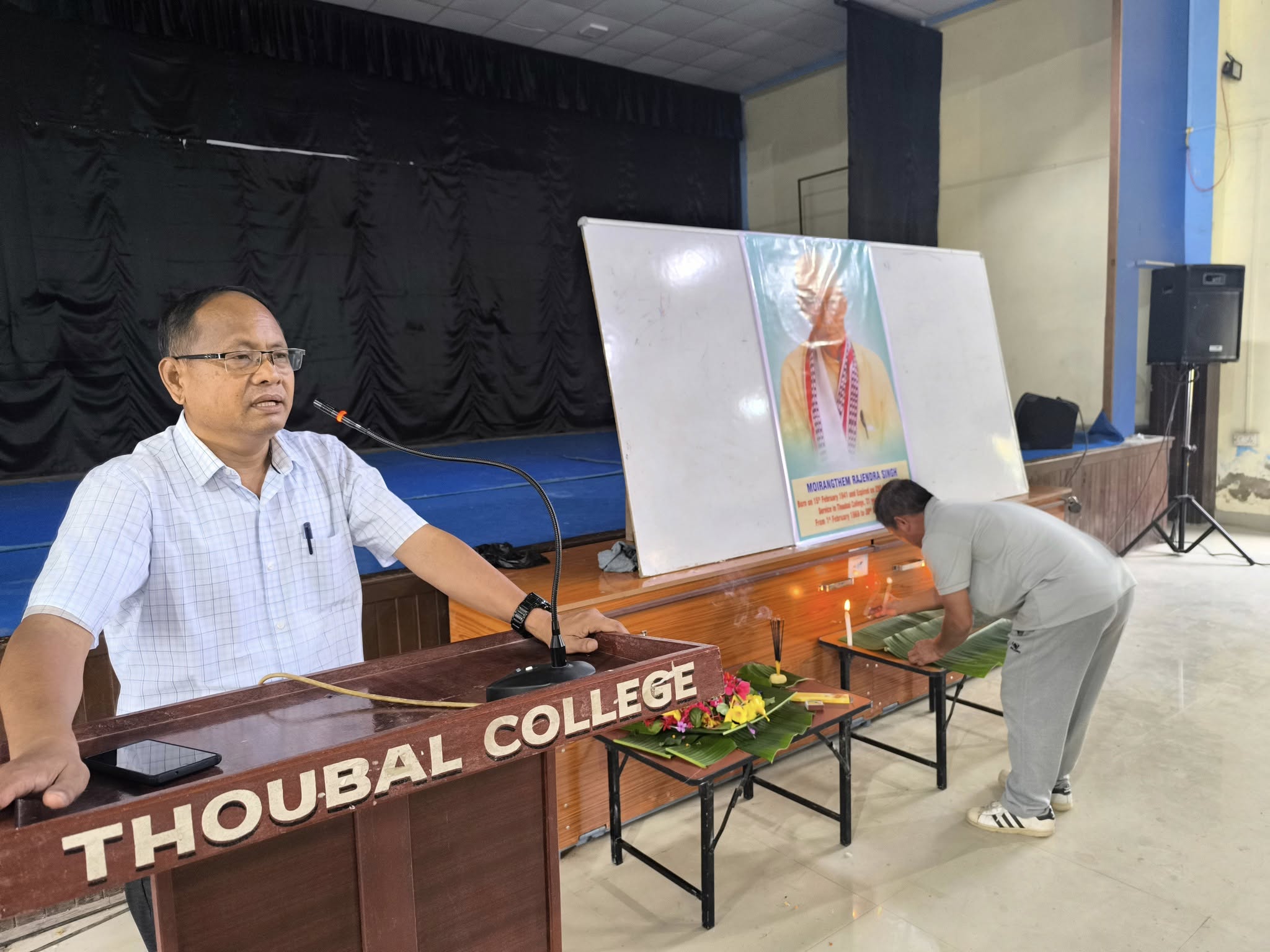 A condolence meeting was held to honour Oja Moirangthem Rajendra Singh, former HOD of Economics Department, Thoubal College on 1st Oct 2025. In a solemn gathering, respects were paid by the faculty members of the college. Remembrance speeches were also delivered by Dr. Debendra (Head, Dept of Economics) and Prof. A. Nabachandra, principal of the college in memory of the departed. Floral tributes were offered in the multipurpose hall of the college.